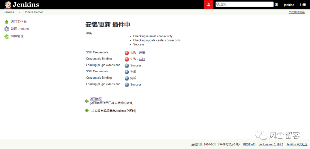 Jenkins插件需要连接默认官网下载,速度非常慢,而且可能会连接超时,故我们跳过本次插件安装.