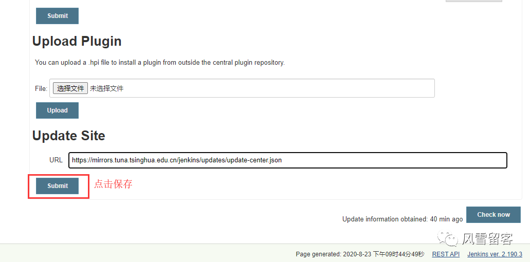 我们可以看到,虽然我们将镜像替换为清华镜像,但是,该文件还是将插件下载链接指向了Jenkins官网,我们可以将第一种方法再执行一遍.