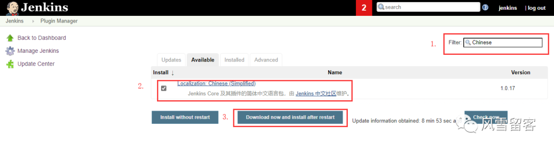 Manage Jenkins->Manage Plugins,点击Available,搜索”Chinese”