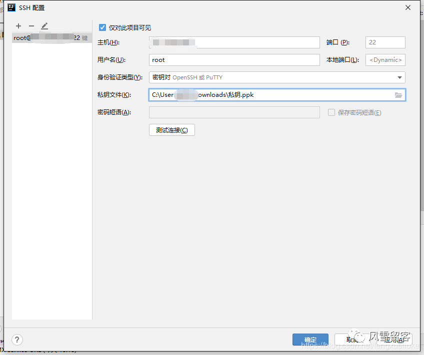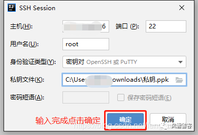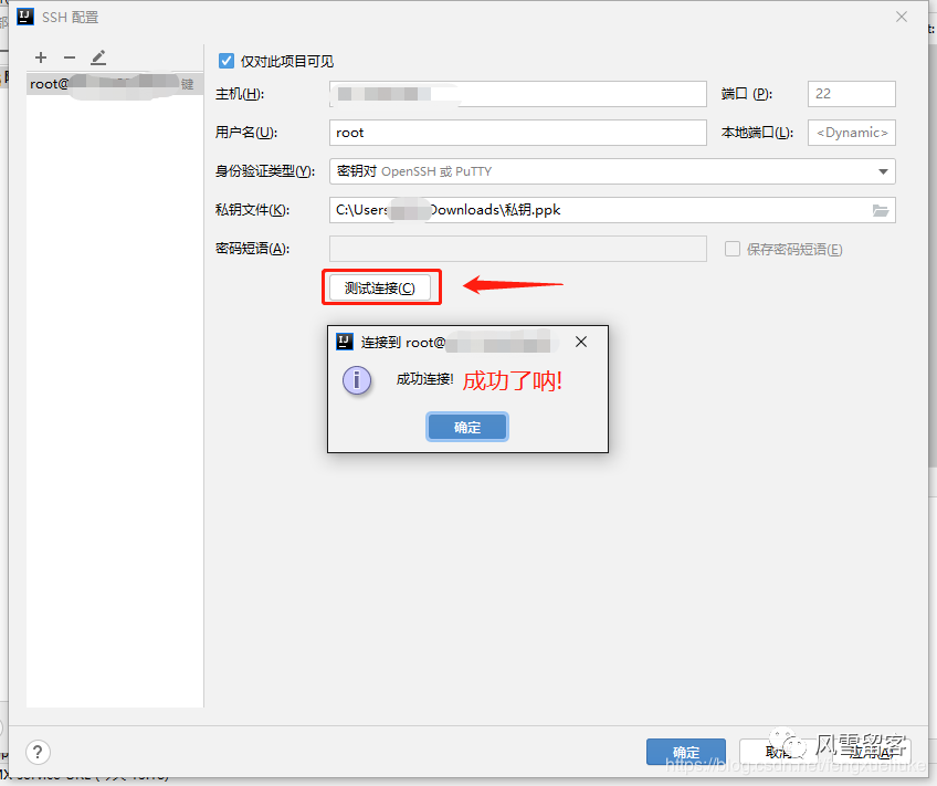 ps:不知道为啥,阿里云服务器输入密码不让连接(即使密码正确)可能是考虑到安全我问题,所以,这里我就用私钥验证了,密码短语不用输入~