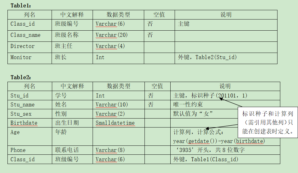 --2create table table_2(Stu_id int not null primary key,--特别注意什么是识别种子Stu_name varchar(20) not null unique,stu_sex varchar(2),Brithday smalldatetime,Age as year(getdate())-year(brithday),Phone varchar(8),Class_id Varchar(6))