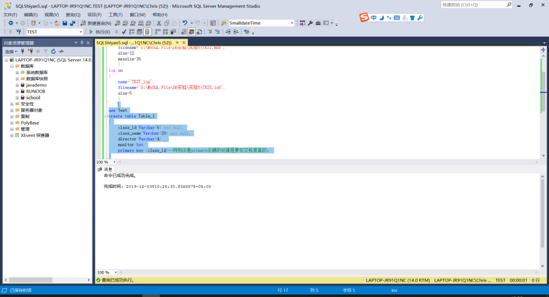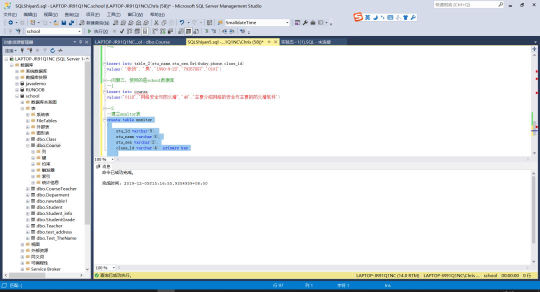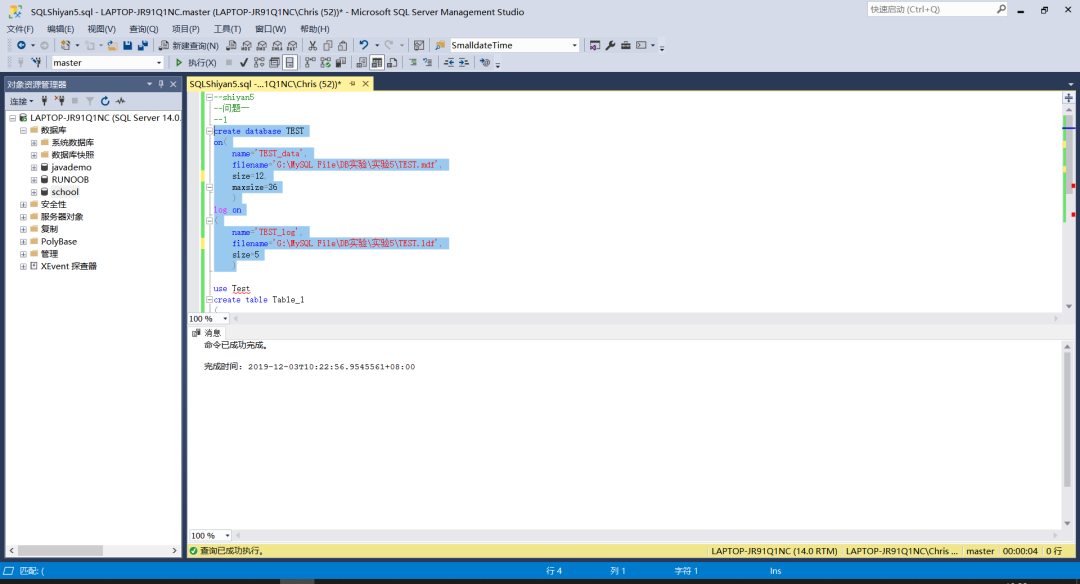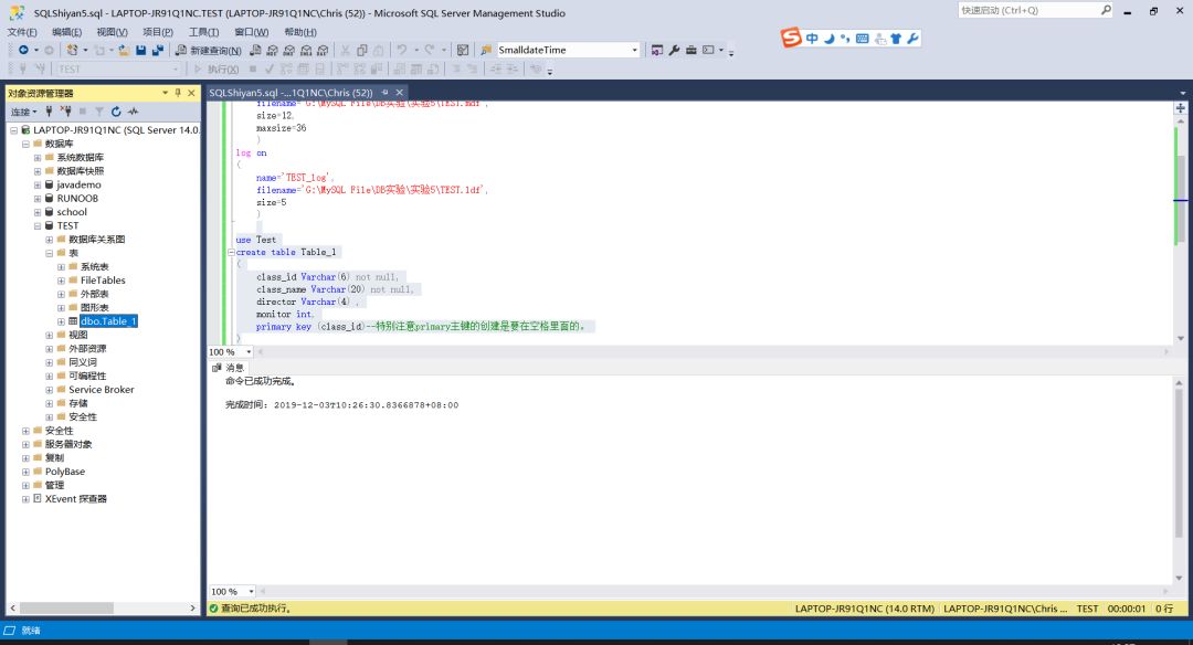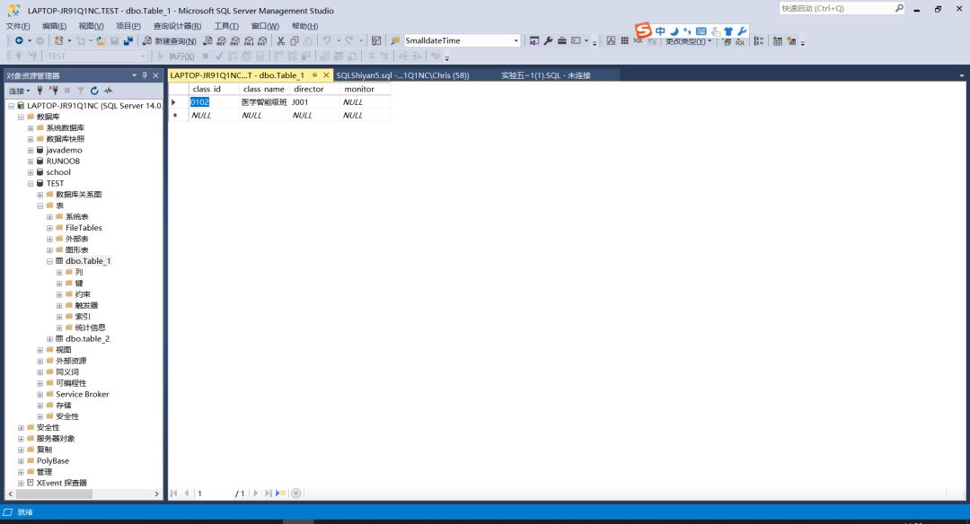 --shiyan5--问题一--1create database TESTon(name='TEST_data',filename='G:\MySQL File\DB实验\实验5\TEST.mdf',size=12,maxsize=36)log on(name='TEST_log',filename='G:\MySQL File\DB实验\实验5\TEST.ldf',size=5)use Testcreate table Table_1(class_id Varchar(6) not null,class_name Varchar(20) not null,director Varchar(4) ,monitor int,primary key (class_id)--特别注意primary主键的创建是要在空格里面的。)
