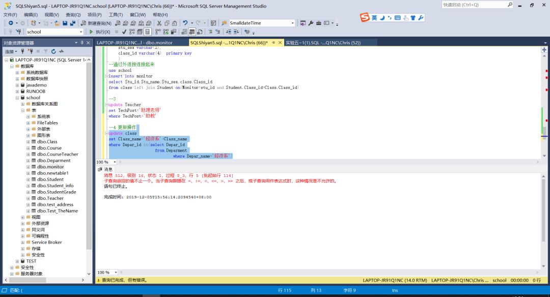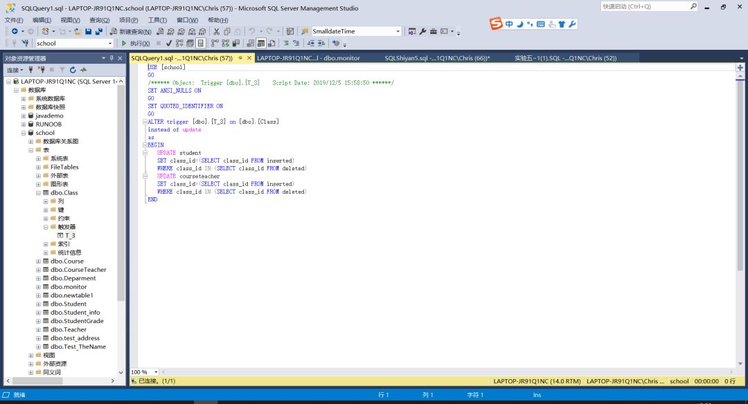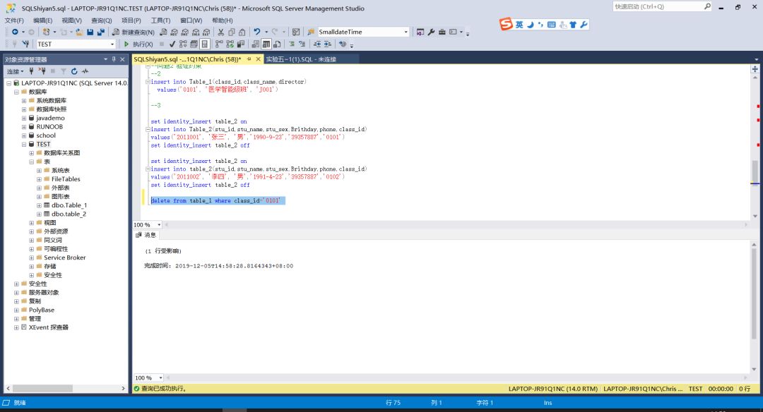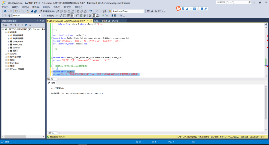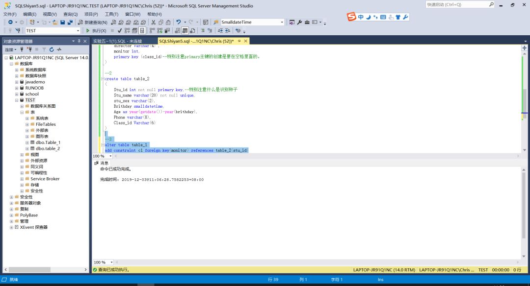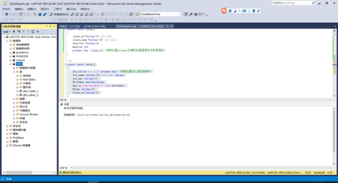 --shiyan5--问题一--1create database TESTon(name='TEST_data',filename='G:\MySQL File\DB实验\实验5\TEST.mdf',size=12,maxsize=36)log on(name='TEST_log',filename='G:\MySQL File\DB实验\实验5\TEST.ldf',size=5)use Testcreate table Table_1(class_id Varchar(6) not null,class_name Varchar(20) not null,director Varchar(4) ,monitor int,primary key (class_id)--特别注意primary主键的创建是要在空格里面的。)