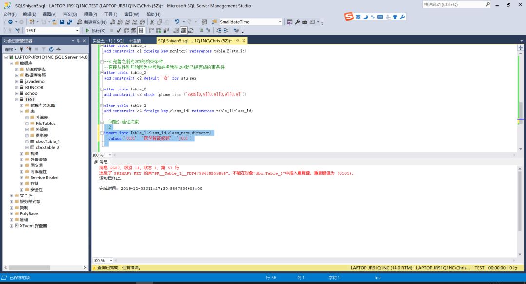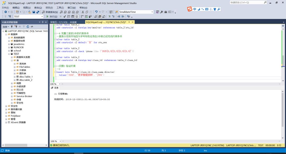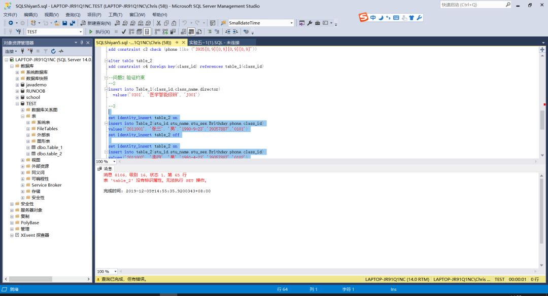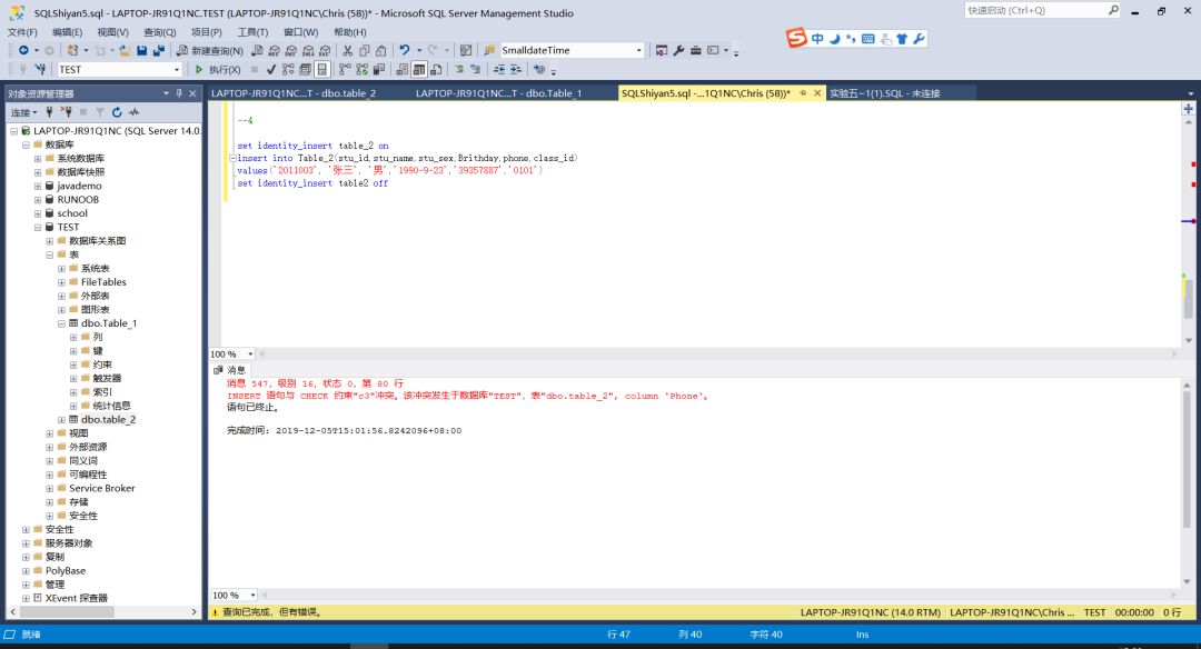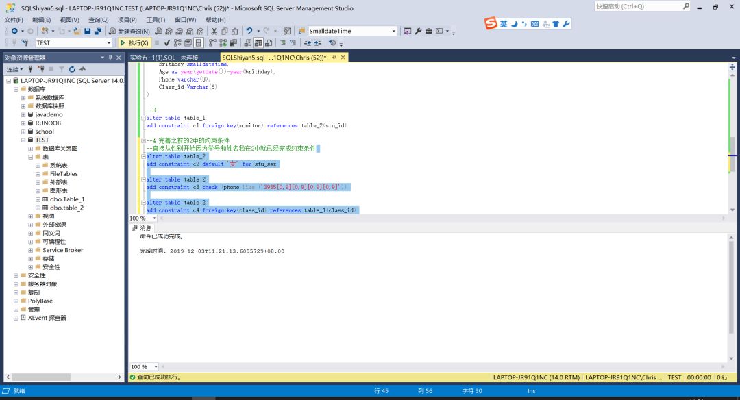 --4 完善之前的2中的约束条件--直接从性别开始因为学号和姓名我在2中就已经完成约束条件alter table table_2add constraint c2 default '女' for stu_sexalter table table_2add constraint c3 check (phone like ('3935[0,9][0,9][0,9][0,9]'))alter table table_2add constraint c4 foreign key(class_id) references table_1(class_id)