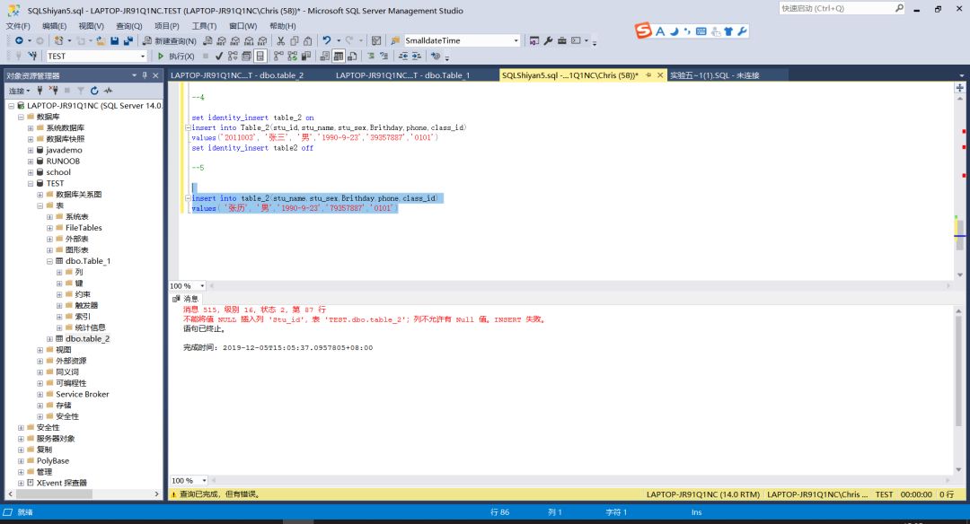 set identity_insert table2 oninsert into Table2(stu_id,stu_name,stu_sex,birthdate,phone,class_id)values('2011003', '张三', '男','1990-9-23','39357887','0101')set identity_insert table2 off