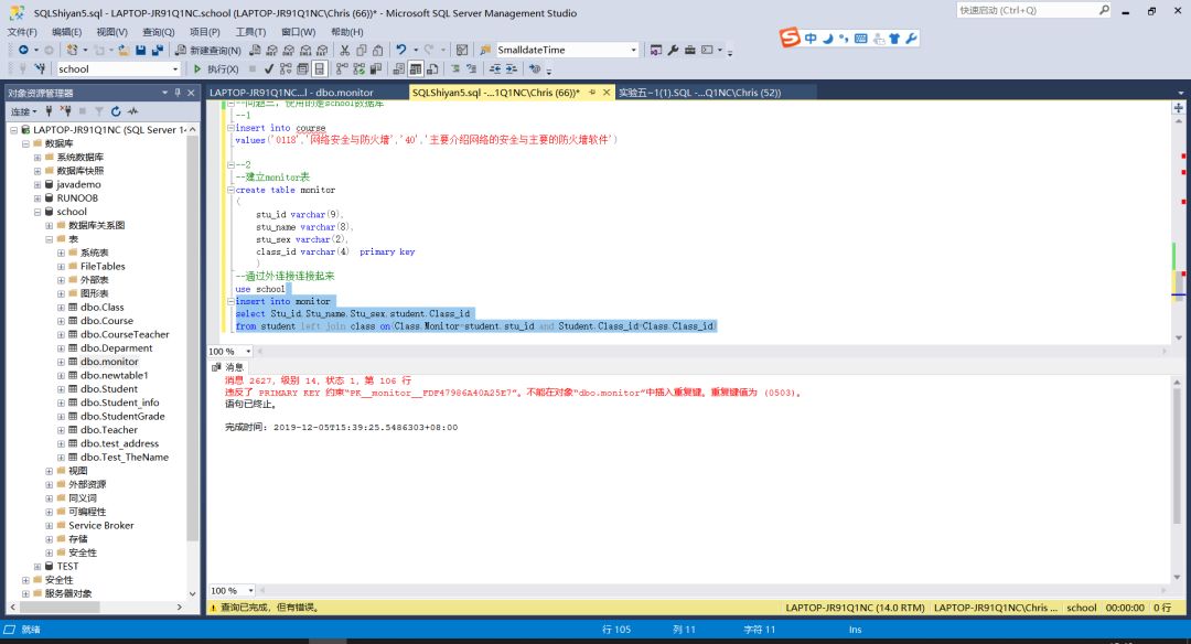 将‘0101’修改为‘0102’就可以运行。因为primary key不发生冲突。
