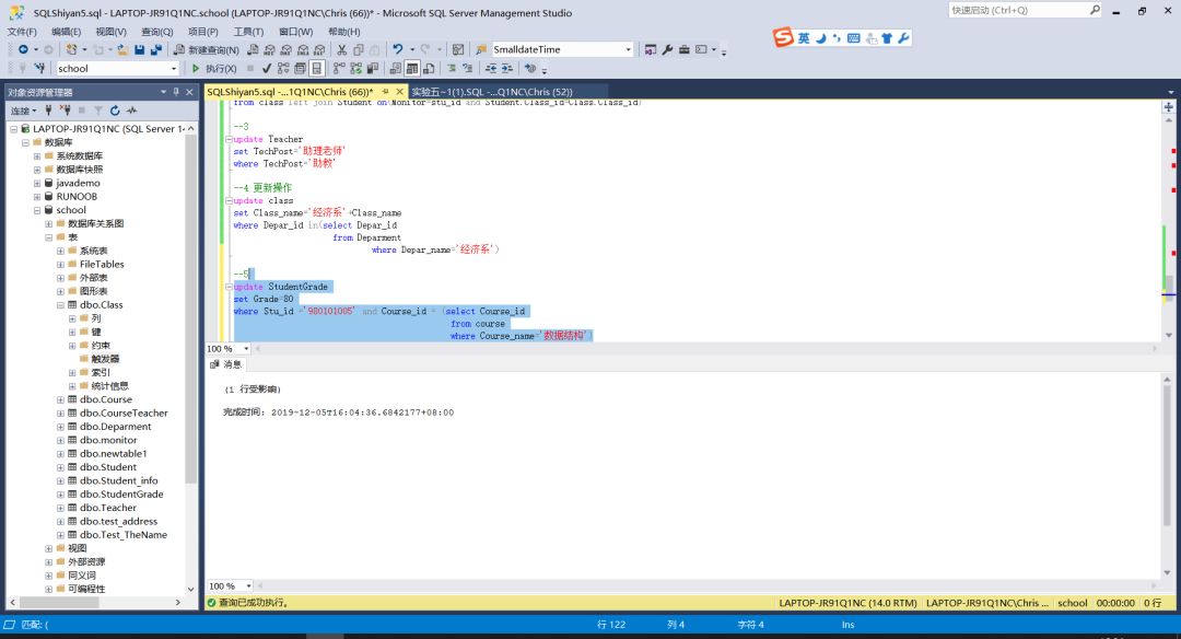 update StudentGradeset Grade=80where Stu_id ='980101005' and Course_id = (select Course_idfrom coursewhere Course_name='数据结构')