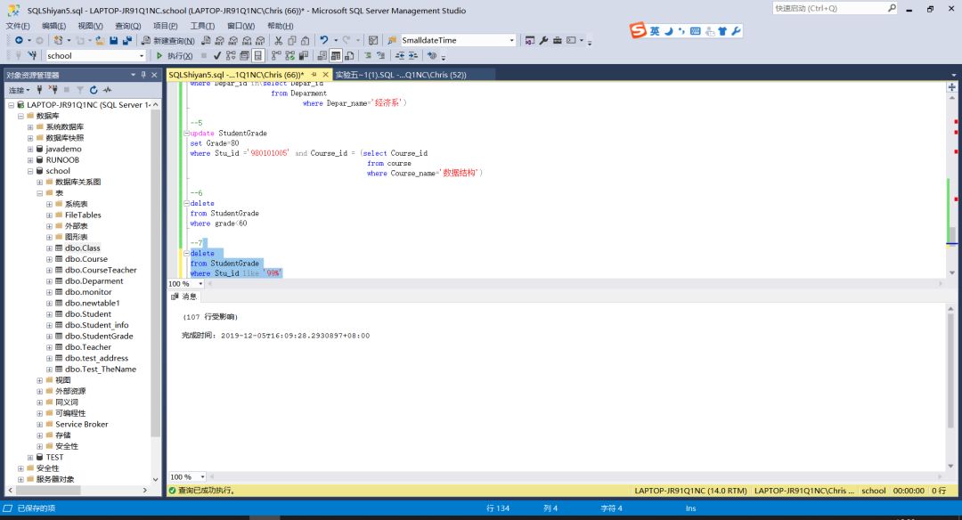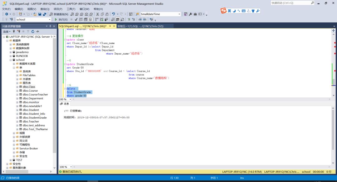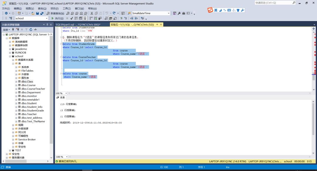 delete from StudentGradewhere Course_id=(select Course_idfrom coursewhere Course_name='C语言')delete from CourseTeacherwhere Course_id=(select Course_idfrom coursewhere Course_name='C语言')delete from coursewhere Course_name='C语言'