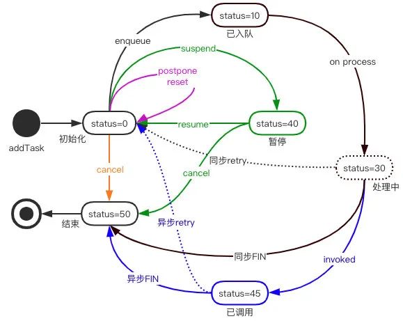 图中不同的颜色代表不同类型的操作。一个任务周期的开始 status=0;任务进入执行队列 status=10;任务执行中 status=30;任务暂停 status=40;任务已发起异步调用 status=45;任务周期的结束 status=50。需要注意的是 status=30 目前仅是虚拟的一个任务状态,是在内存中的处理状态,由于变化很快,没有持久化,仅代表一个任务消费回调的过程。