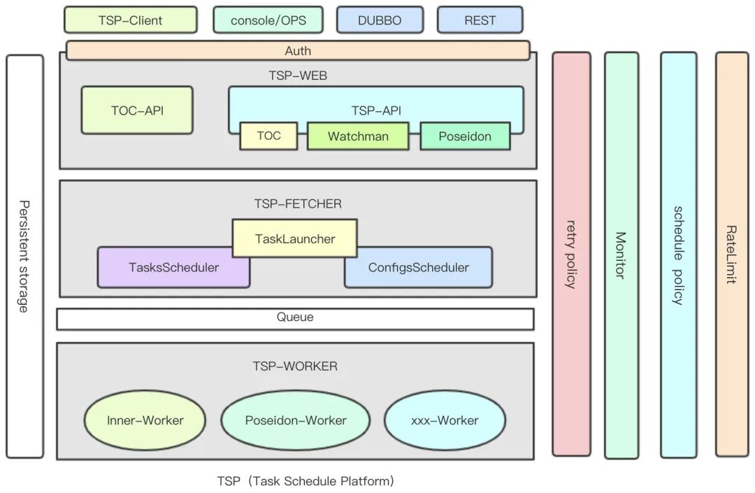 由于 Watchman 和 TOC 在架构上有类似的地方, 都是为了满足业务方在指定的时间按照一定的策略回调业务代码的能力。同时,我们也发现有部分业务为了满足一些定制化需求,自己也实现了一部分的任务调度功能。比如框架组提供了异步执行引擎(Poseidon);零售团队实现了一个基于 Watchman 引擎的导入、导出、异步耗时任务框架。这几个零散的产品都是业务因为 TOC 和 Watchman 无法直接满足业务的定制功能而做的额外的功能开发。目前分散在几个团队,不好管理,也存在一些通用功能的重复开发工作。为了将各种任务调度类型的产品整合起来,并且具备业务扩展能力,诞生了 TSP(Task Schedule Platform) 这样一个任务调度平台。