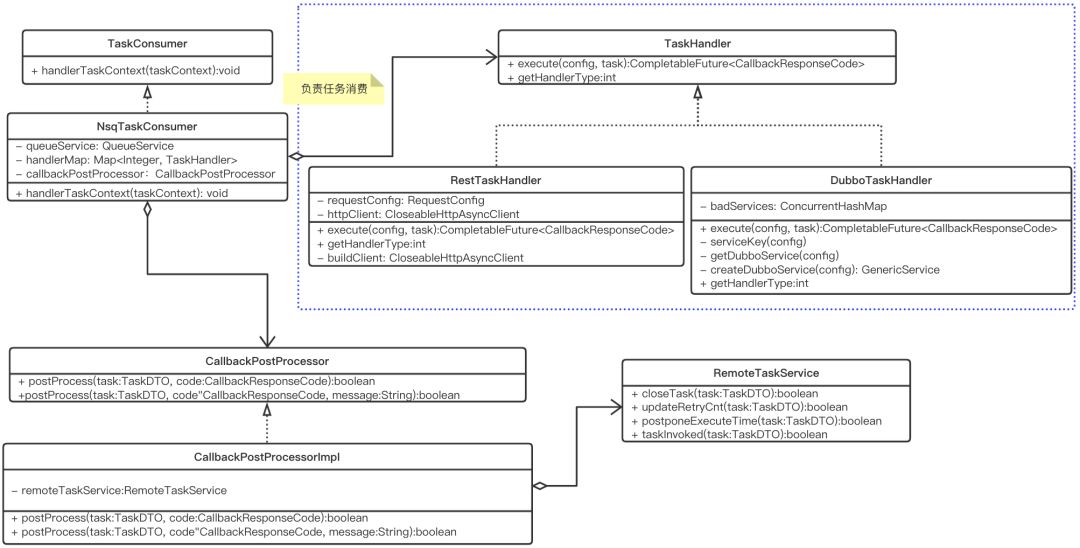 执行。TaskHandler: 用户通过实现该类进行消费逻辑定制化,实现它的