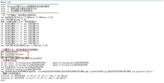 按照图示部分修改需要备份数据库的用户名、密码和实例名,备份位置可以根据情况修改,这里是备份在D:ackup