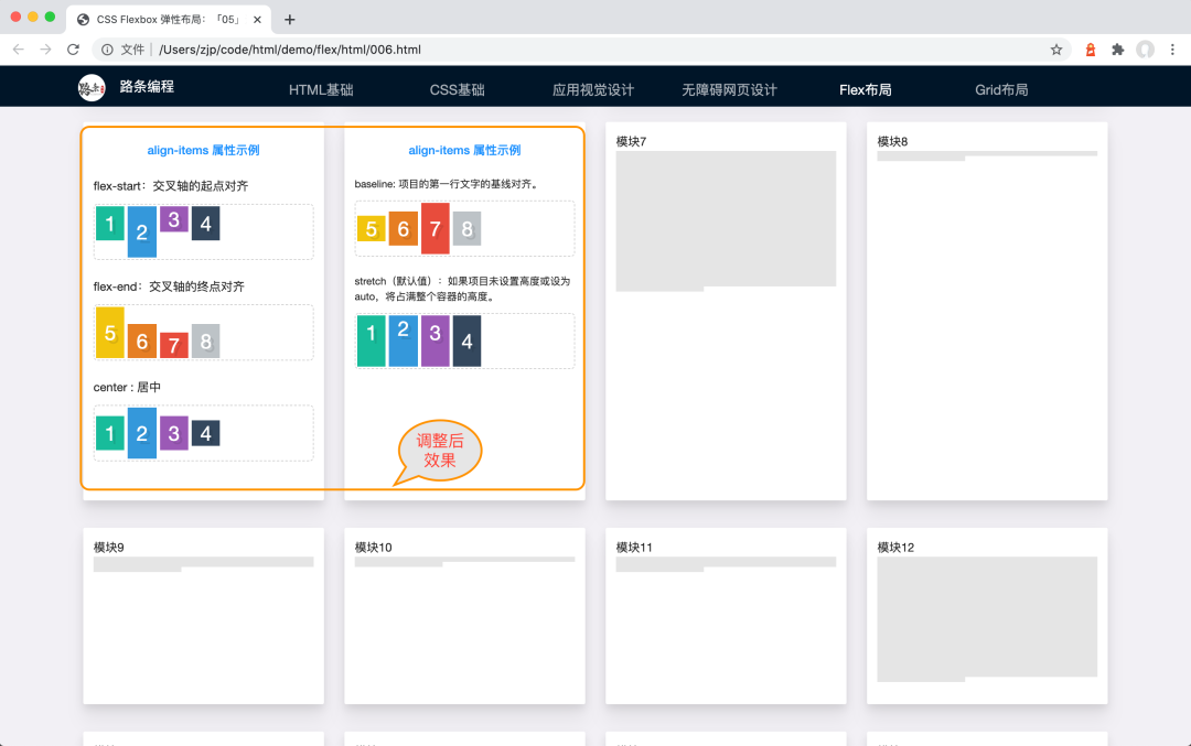调整页面框架模块 5 ,模块 6 内容。模块 5 分为上中下三部分,每一部分显示 4 个项目, 通过容器类 .container-dashed 进行上中下三部分区分。为了显示 5 种常用属性样式,增加了 .align-items-start、.align-items-end、.align-items-center、.align-items-baseline、.align-items-stretch 5 种样式类。第一部分显示 flex-start:交叉轴的起点对齐。容器元素增加样式类 .align-items-start , 为了区别每个项目的高度,增加了 .box-heigh, .box-short 两个样式类,项目 2 增加样式类 .box-heigh, 项目 3 增加样式类 .box-short。第二部分显示 flex-end:交叉轴的终点对齐。第三部分显示 center : 居中。第二三部分项目样式设置详情请看 html 代码部分。模块 6 分为上下两部分,第一部分显示为 baseline: 项目的第一行文字的基线对齐,第二部分显示为 stretch(默认值):如果项目未设置高度或设为auto,将占满整个容器的高度。项目具体设置详情请看 html 代码部分。