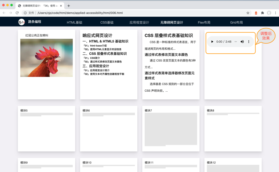 在文章 “无障碍网页设计:「05」使用 header、nav、footer 标签使屏幕阅读器更容易导航” 代码基础上,在页面 style 区增加音频样式类定义 .card audio , 设置音频控件占模块 4 宽度的 90% , 距离模块边框顶部 20px,调整样式代码如下所示: