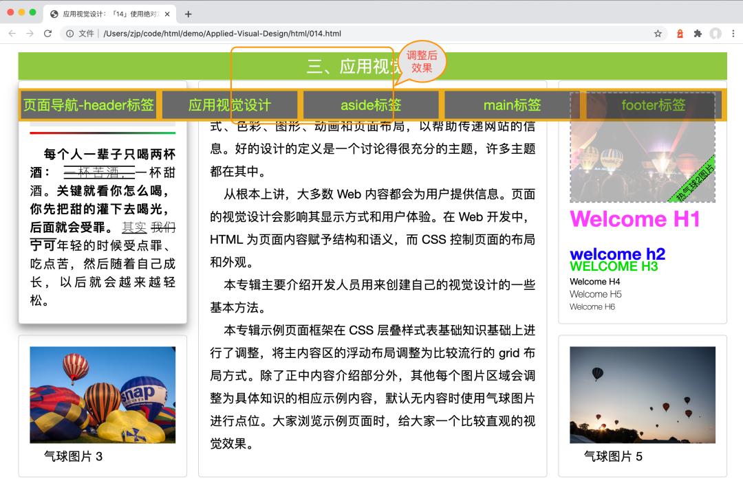 以上代码重新设置了 .layout 类,将顶部内边距调整为 5px, 将 .header 和 .nav 类设置为 position: fixed , 为了实现标题栏及导航栏居中显示,需要增加 left: 0; right: 0; 设置。如果想实现水平及垂直方式都居中显示,需要增加 left:0; right:0; top:0; bottom:0; 4 个属性的设置。保存页面,大家可以通过示例页面或下面的完整效果图比较下应用样式的效果,调整页面效果如下:重要提示:示例效果预览,请访问 https://www.icoderoad.com , 完整代码查看及下载,请访问 https://github.com/icoderoad/demo。