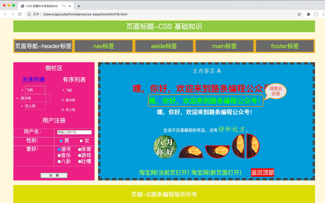 代码调整后保存代码预览页面,与 “ CSS 层叠样式表基础知识:「17」通过十六进制颜色设置元素样式 ” 文章预览效果进行比较,页面效果没有变化。说明 RGB 值与十六进制颜色效果一致。