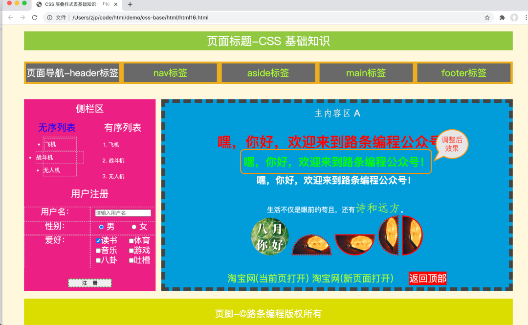大家可以按以上文章介绍的顺序进行 CSS 声明,并按相应顺序进行相关的 CSS 声明覆盖操作,预览页面查看每次覆盖后的页面效果,页面最终保持在设置完 !important 的效果,页面具体效果如下: