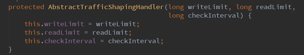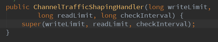 ChannelTrafficShappingHandler有三个构造方法,如下的构造方法传入写入限流的字节,即writeLimit的单位是Byte,即checkInterval周期内允许写入最大writeLimit字节。允许读取readLimit字节数。