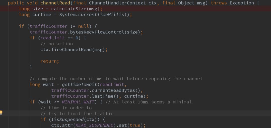 我们继续看channelRead方法的源码。由于trafficCounter不为空,然后计算wait时间。这里的wait时间是计算需要暂停读取消息的时间,源码如下。