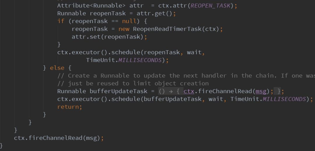 如果当前设置暂停读取,则封装成一个reopen_task,等待wait时间后再重新设置可读状态并去从缓冲区读取数据。如果当前的ctx已经暂停了,则封装成一个Runnable,等待wait时间后向后面的handler传递消息。