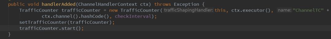 ChannelTrafficShappingHandler类中通信的channel被添加到pipeline上就进行了初始化,然后调用父类AbstractTrafficShappingHandler中的