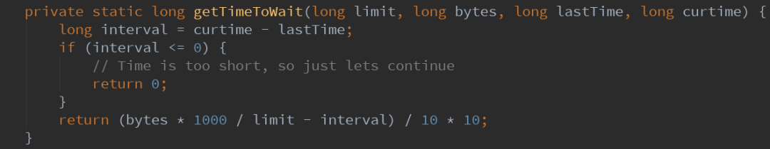 如果当前时间减去上一次的时间太小,那么返回0。否则进行计算等待时间。 这里我们假如读取到缓冲区数据2000byte,但是设置的readlimit为1000,那么(byte*1000/limit)=2000ms,相当于当前读取的字节应该是2000ms发送完。然后减去interval,也就是去掉消耗的时间,还剩1500ms需要等待。