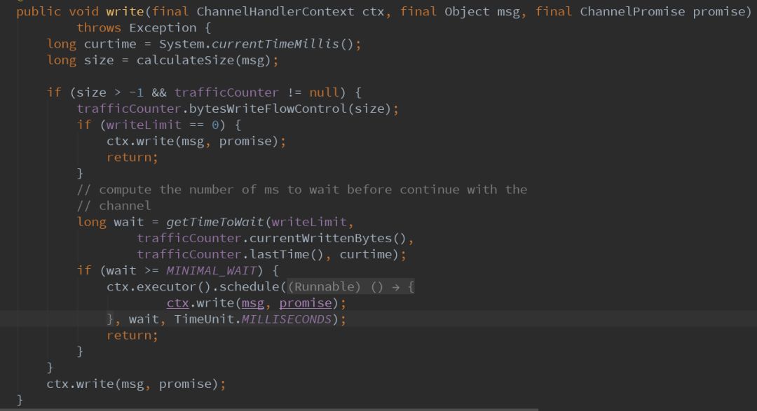 write方法的源码,在计算出wait时间后,然后使用当前EventLoop线程的schedule方法等待wait时间后再将当前msg传递下去。