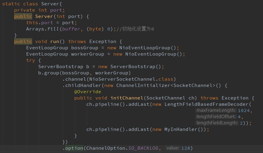 创建一个Server类,这里使用基于长度域的编解码器:LengthFieldBasedFrameDecoder。