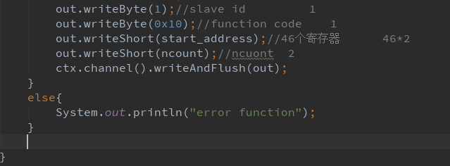 如果是写请求,那么请求中会包括起始地址和写寄存器数量以及数据。我们解析请求将数据更新到本地管理的Byte数组对应的位置即可。