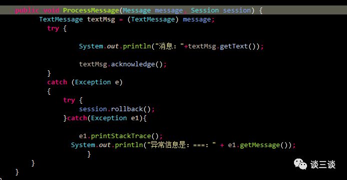 其次,在Consumer端,处理消息中出现异常,就进行事务操作,也就是在异常中进行事务的回滚操作。代码如下: