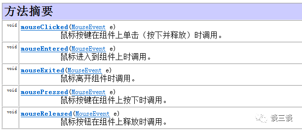 在Java的Swing中,接口 MouseListener中定义了很多鼠标操作的监听事件,如下所示: