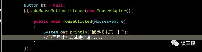 然后用一个类 MouseAdapter实现了接口 MouseListener中所有方法(空实现),然后在使用的时候,直接创建MouseAdapter类的子类,去实现某一个方法即可。