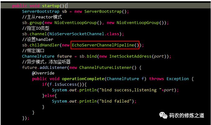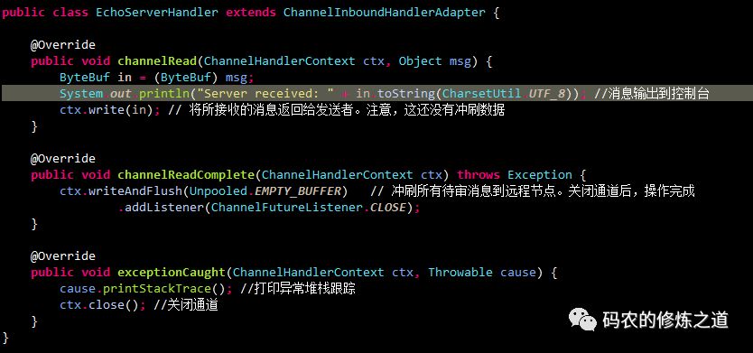 (3)指定handler。这里的EchoServerChannelPipeline类继承了抽象类ChannelInboundHandlerAdapter,并实现其中的方法。