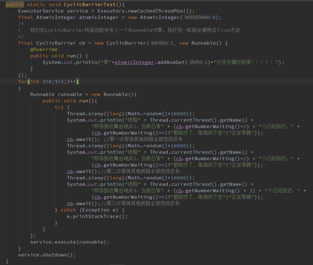 此外,在执行完任务的时候,调用了构造方法传递进去的Runnable对象的run方法,这个在源码里面也有体现。这里从输出结果可以看出,三个线程执行完第一步以后,控制台输出“第一次任务结束”这样的标志。上面使用了一个AtomicInteger来记录任务的重复次数。