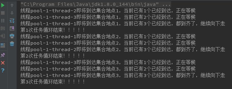 这里在CyclicBarrier的构造方法中加了一个AtomicInteger来统计关卡,每通过一关,就打印出当前执行完第几次任务。