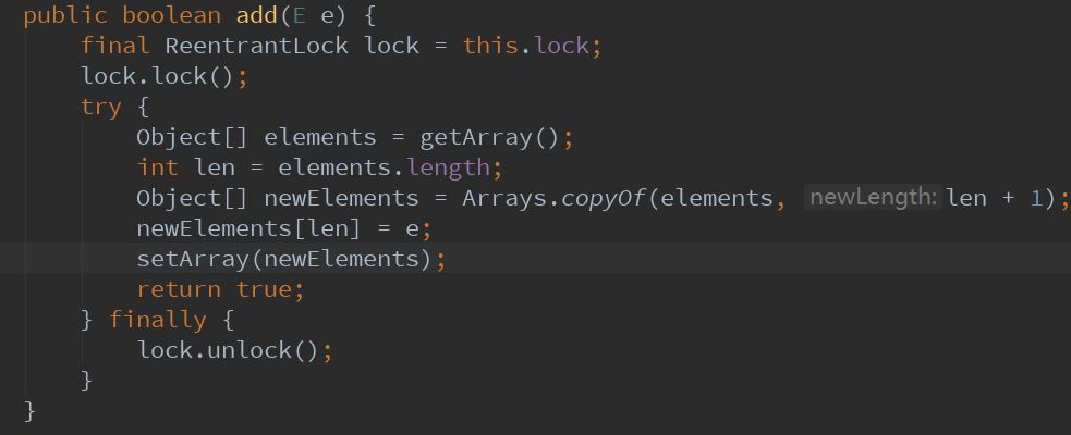 上面的源码中,首先获取锁。然后调用getArray得到本地的数组。然后调用Arrays的copyof方法将array数组复制到新数组中,接着添加元素到新数组中。最后,调用setArray方法将新数组newElements代替之前的array。最终,释放锁。