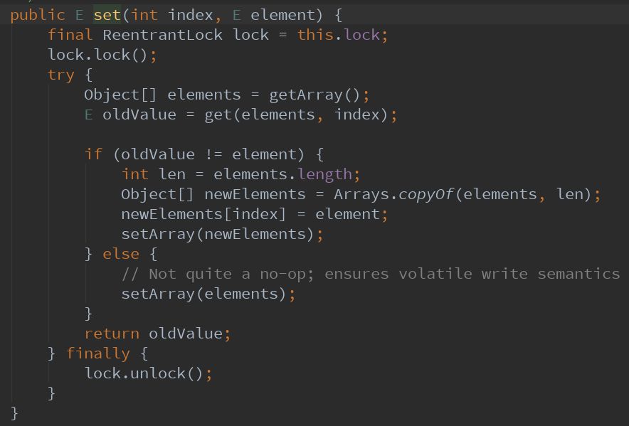 从上面的源码可以看出,首先肯定还是加锁,最后是否锁的操作。这样可以阻止其他线程对array数组的修改。这个代码首先获取oldValue值,如果oldValue和传入的参数element不相等,才进行修改。修改的过程和add元素相似,都是新建一个数组,然后将array数组拷贝出来,然后修改指定下标值,最后重新将新数组设置成本地的array数组。