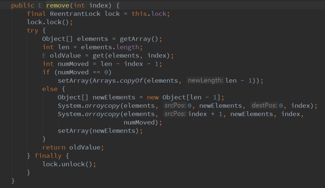 从源码可以看出,首先加锁、最后释放锁。在try语句中,首先获取当前array数组,然后调用get方法获取指定下标元素oldValue。然后计算新数组的长度numMoved。
