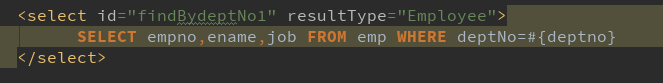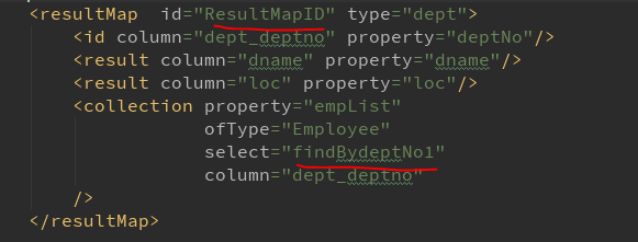 整个子查询的顺序是,通过select标签id为findBydeptNo2进行查询,然后映射关系指向上面的resultMap。在resultMap中的collection,使用findBydeptNo1的select语句进行查询。