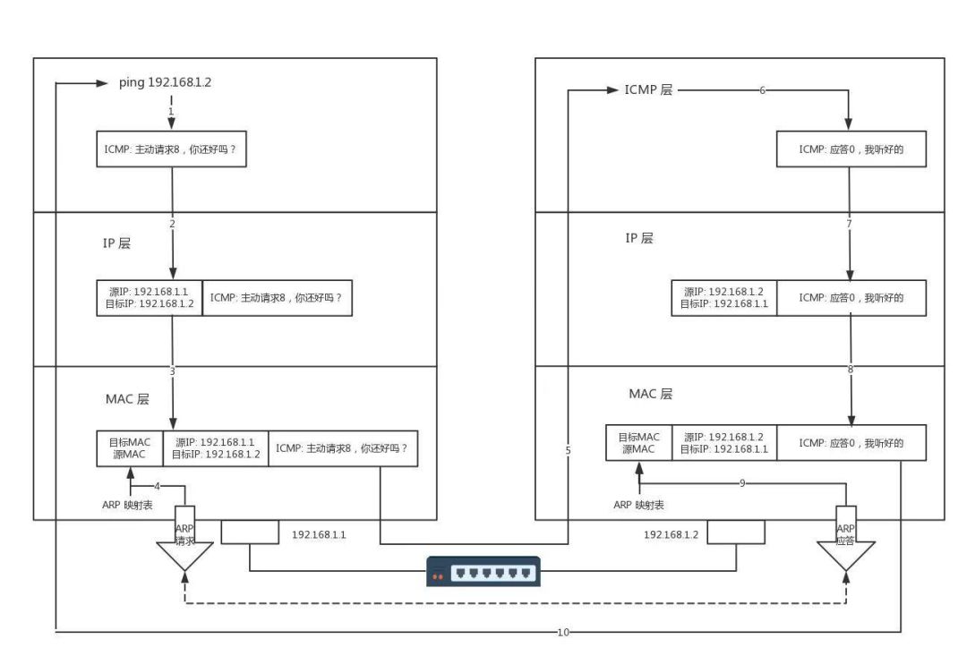 然后ICMP将报文和目的IP地址192.168.1.2一起交给IP层去处理,IP层将以192.168.1.2作为目的地址,本机地址作为源地址构建出IP报文。