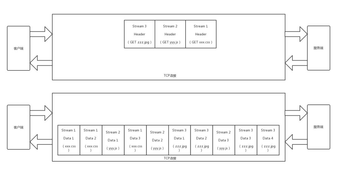 Http2.0对Http头进行了压缩,将每次需要携带的大量key-value在两端建立索引表,相同的头只发送索引即可。Http2.0还将传输信息切割为更小的流和帧,分为head帧和Data帧,并对这些二进制进行编码优化(你可以想象Protobuf序列化可以压缩空间)。这里的Data流可以将请求分到不同的流中,就处理了Http1.1中串行的问题。比如下面这个例子: