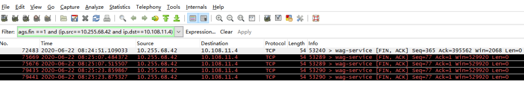 根据项目反馈的配置信息,现场客户端A端的IP是10.255.68.42,服务器B端的IP是10.108.11.4,实时任务的端口是2608。在该产品的设计中,A端为客户端,B端为服务器端,采用的传统的C/S架构。 由于是反复断开、连接,因此我需要在wireshark抓包中看一下FIN报文有没有。于是使用过滤命令筛选如下:tcp.flags.fin ==1 and (ip.dst==10.255.68.42 and ip.src==10.108.11.4)我们发现,从服务器B端没有FIN报文发给客户端A。然后我们再看看是不是客户端A主动发起的断开连接,从而发送了FIN报文。过滤命令如下:tcp.flags.fin ==1 and(ip.src==10.255.68.42 and ip.dst==10.108.11.4)果然发现了FIN报文从客户端侧发送给服务端侧的。