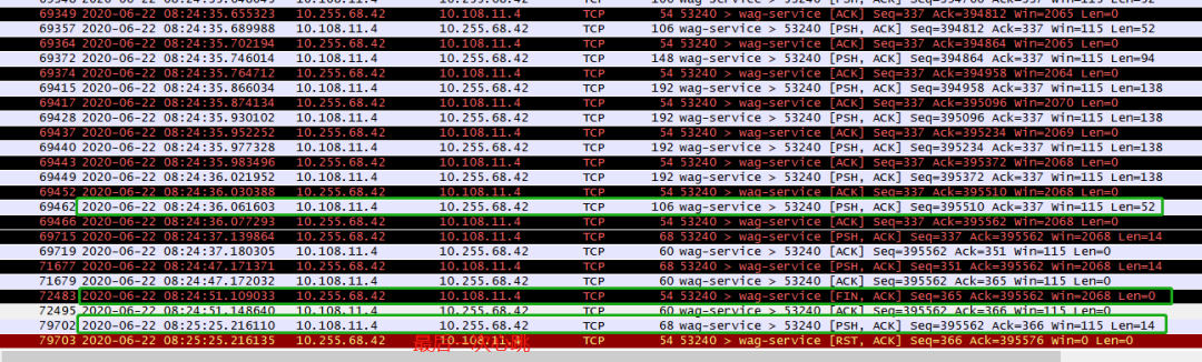 1、序号69462的报文是由服务端B发了最后一包Len=52字节的消息。2、序号72481的报文由于客户端A检查超时,关闭连接。系统内核会生成一个FIN报文,然后序号72495报文由服务端B侧的内核进行了ACK应答。3、序号为79702的报文继续使用之前的链路发送一个长度为14字节的心跳包,由于链路不可用,因此客户端A侧内核主动生成了RST报文,提醒此链路不可用。