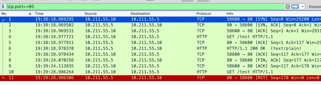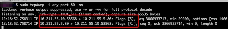 实际上这种场景,通过抓包也是可以看到RST报文的。比如我所在的虚拟机80端口没有监听,这个时候客户端想连接服务端的 80 端口会怎样呢?在客户端(10.211.55.10)开启 tcpdump 抓包,然后尝试连接服务器的 80 端口。