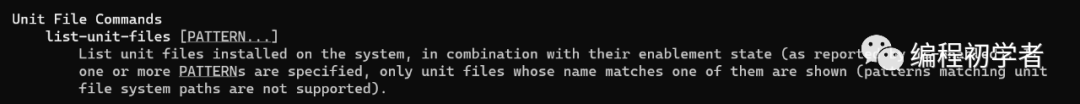 基本就是列出系统上安装了的文件,结合它们的启用状态(就和is-enabled反馈的一样)。如果指定了模式,命令会做模式匹配,只有匹配上了,才会展示文件。另外,模式匹配不支持单元文件系统路径的匹配。