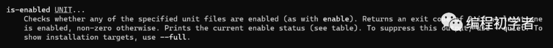 检查指定的单元文件是否已经启用。如果至少有一个已经启用,返回退出码0,否则返回非0。同时打印当前的启用状态,见下表。加上 --quiet 可以不看输出的内容。加上 --full 显示安装目标。