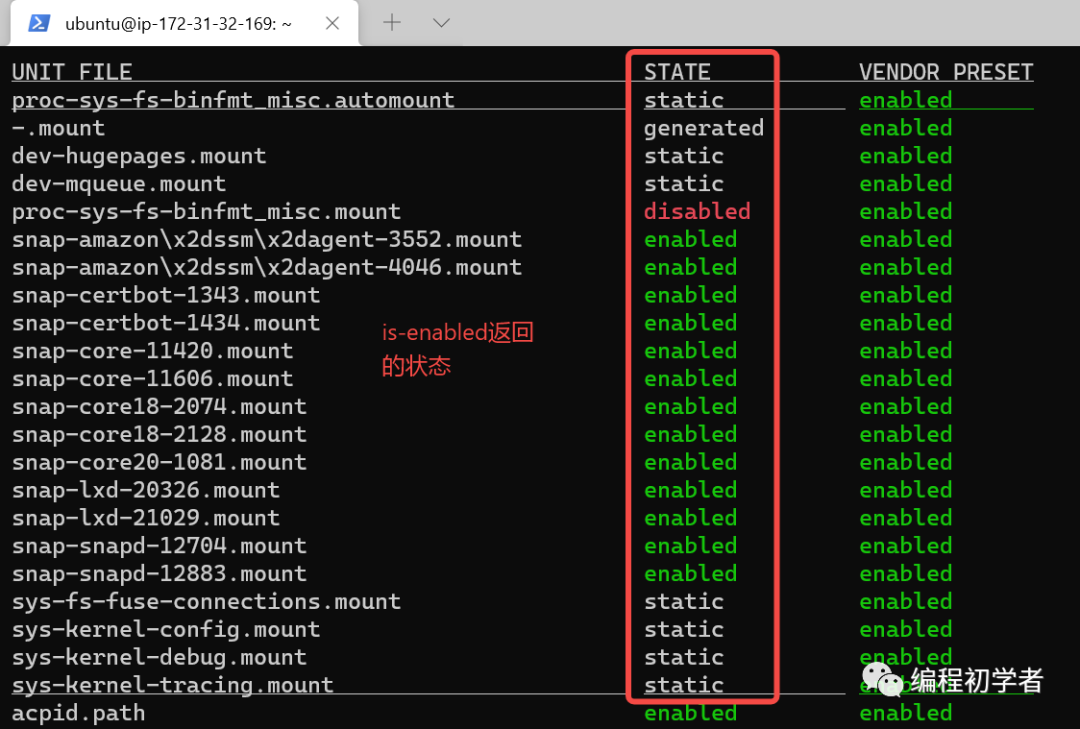 | "enabled" "enabled-runtime" | 通过 .wants/, .requires/ 或Aias= 表征链接启用。跨重启的文件放在 /etc/systemd/system/;一次性文件放在 /run/systemd/system/ | 0 |