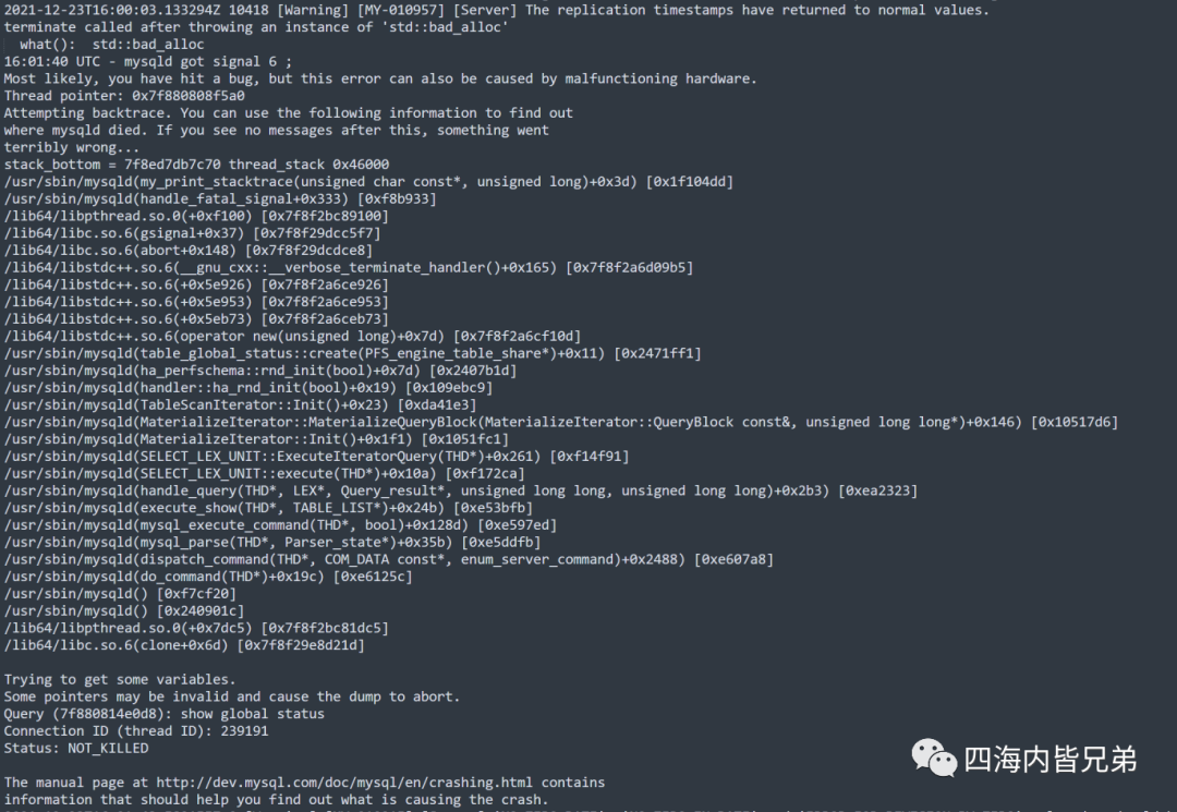 std::bad_alloc这个报错经过查询是C++的输出,该异常是因为在使用new分配内存空间时,内存空间不够时就会抛出该异常。这么一想就通了。MySQL是C写的。那么一定是数据库需要内存而没有,导致了数据库异常退出。
