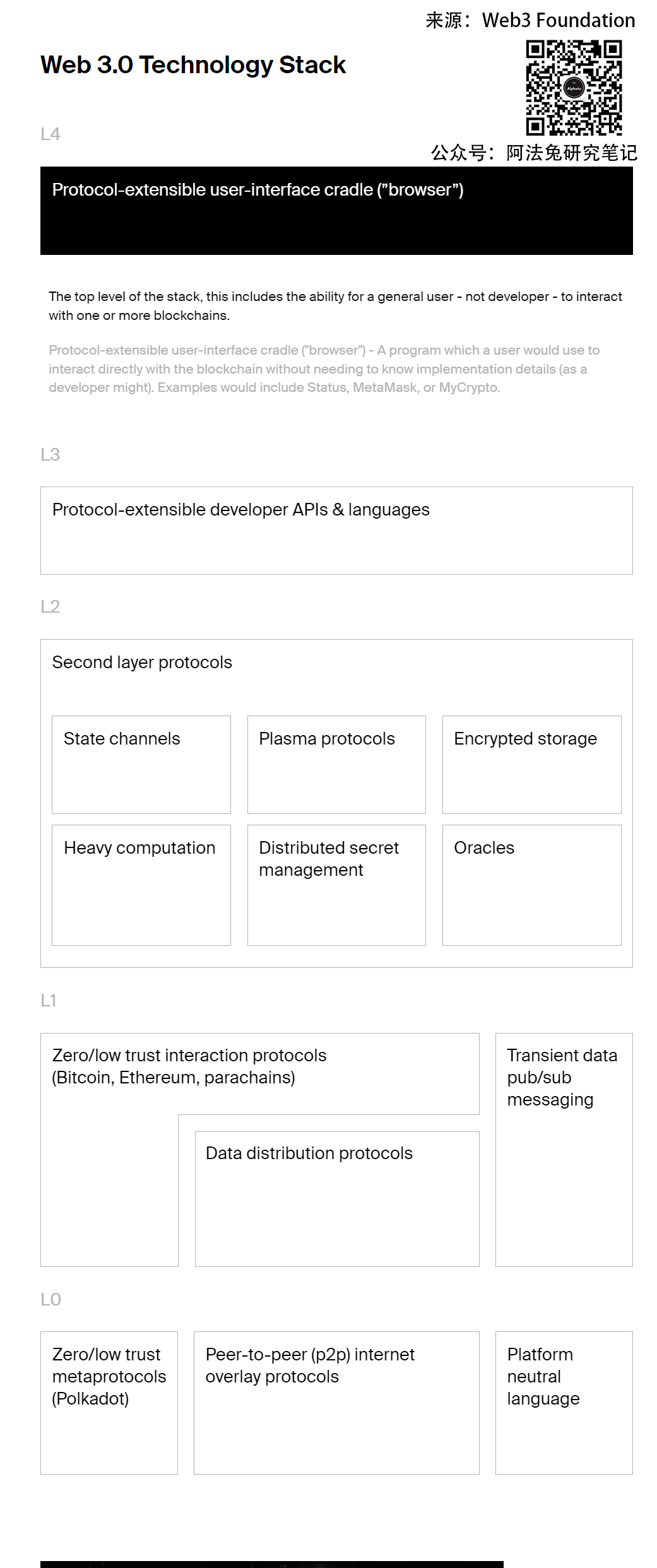 为了更清晰地对Web3的技术层面进行解释,我们来看一下Web3 Foundation对Web3技术栈的解释: