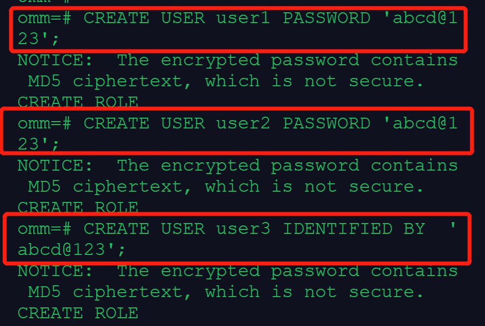 1.创建用户user1、user2和user3,user1具有CREATEROLE权限,user2具有CREATEDB权限,要求使用两种不同的方法设置密码